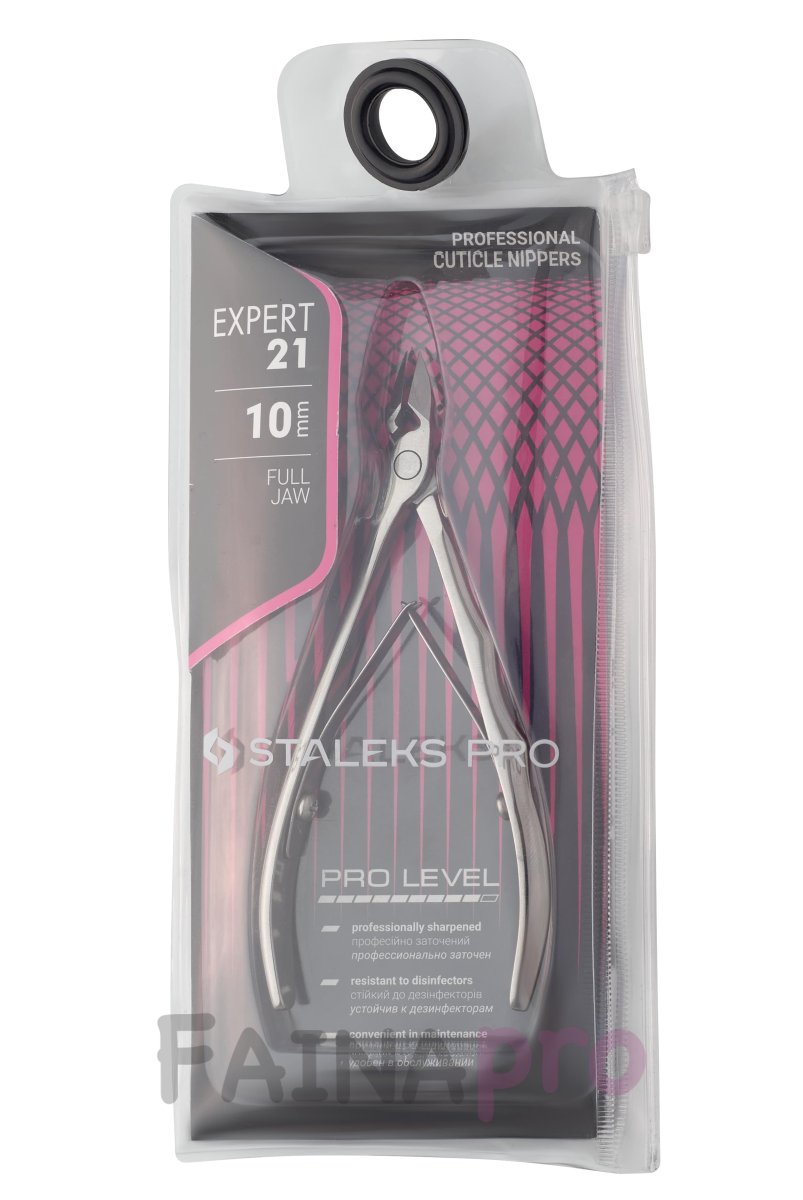 Модель кусачок NE-21-10 серії Expert від Staleks Pro має довжину лез 10 мм, прямі ріжучі кромки під нахилом і звужену форму робочої частини.