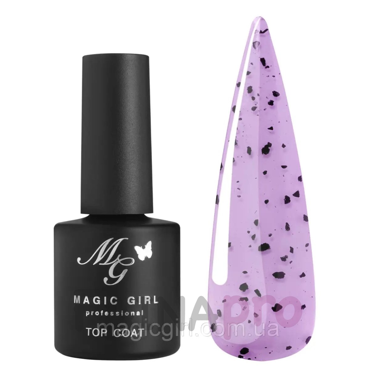 Топове покриття Crumb (крихта) Magic Girl - це прозоре, фінішне покриття з трендовими чорними пластівцями (крупинками). Топ захищає від зовнішніх факторів, що впливають на нігтьове покриття, від подряпин та ударів.