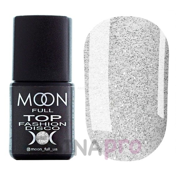 Moon Full Top Fashion Disco – фантастичний танець світла на нігтиках! Даний топ містить спеціальні світловідбиваючі блискітки, завдяки яким химерно грає, переливається та виблискує. Особливо яскраво виглядає у темряві, пронизаній променями штучного світла. Будь-який гель-лак під ним виглядає чарівно, незвично та дуже ефектно. Топ не має залишкової липкості. Комфортна консистенція дозволяє наносити його швидко та точно, після нанесення на нігтьову поверхню фініш легко самовирівнюється, не затікає. Крім візуальної краси також забезпечує гель-лаковому покриттю стійкість, запобігає ушкодженням, сколам.